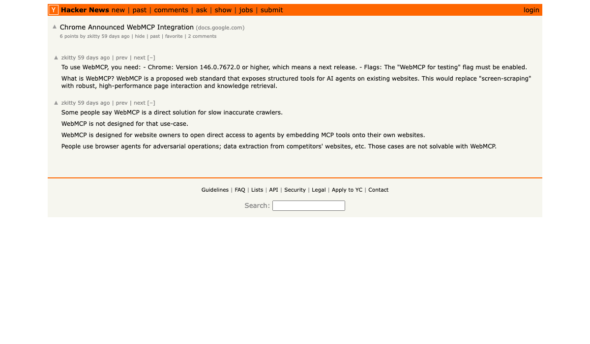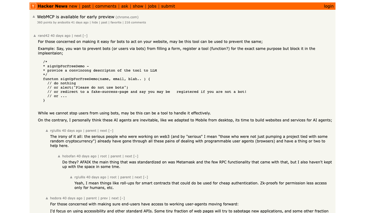 Both represent the same directional shift. When Chrome announced WebMCP integration, hundreds of Hacker News comments followed because developers recognized what it means — AI agents interacting with browsers through structured protocols instead of screen scraping and DOM guessing.