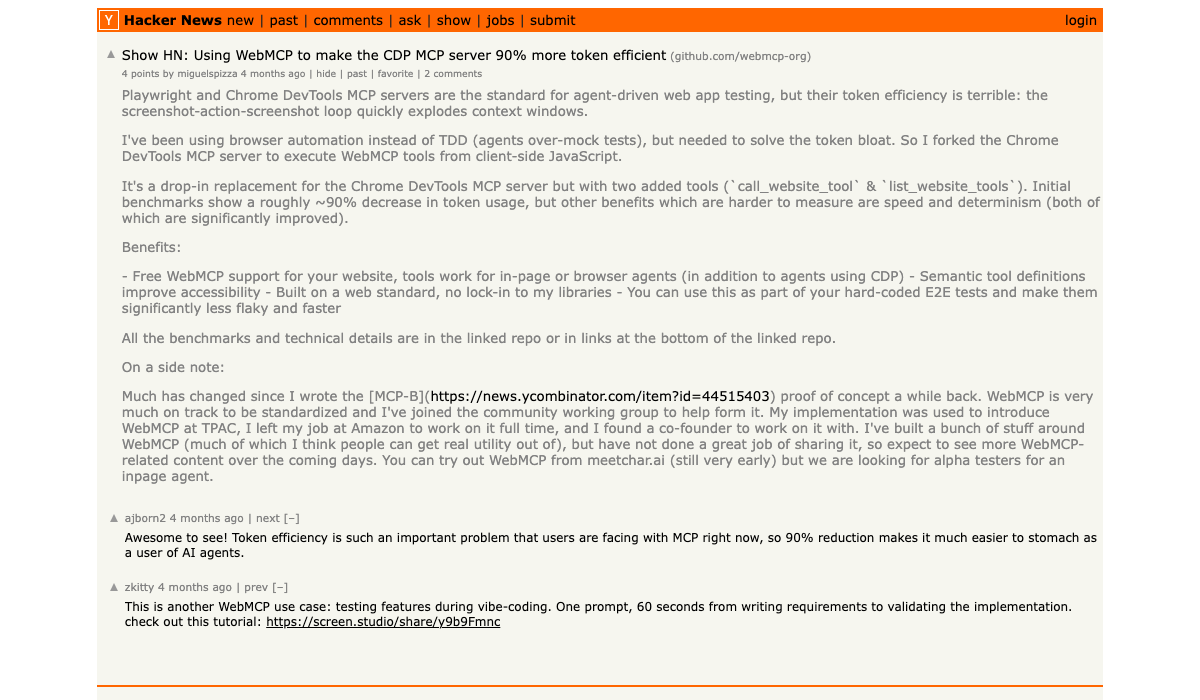 The Hacker News community captured the developer reaction when Chrome announced WebMCP: "WebMCP replaces screen-scraping with robust, high-performance page interaction." The efficiency gains are significant — a December 2025 Show HN post demonstrated using WebMCP to make the Chrome DevTools MCP server 90% more token-efficient. That number reflects how much waste exists in having agents interpret raw DOM versus receiving structured data.