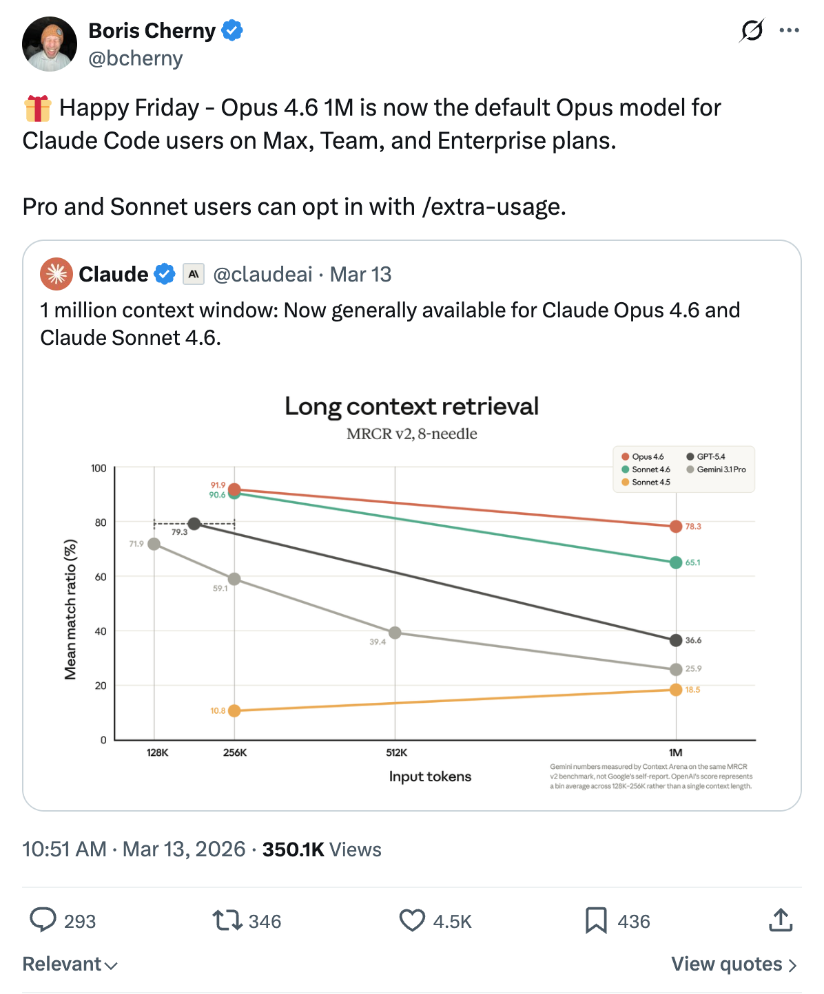 Claude Opus 4.6 and Sonnet 4.6: 1M tokens. No long-context premium. 78.3% MRCR v2 retrieval at 1M.