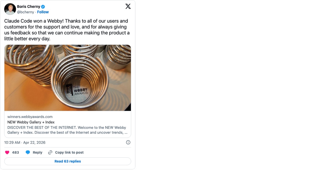 Claude Code just won a Webby Award for Best Product or Service in AI Features & Innovation. Boris Cherny, Claude Code's PM at Anthropic, announced the win on X to a wave of congratulations from the developer community: