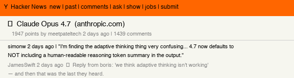 The HN thread on Claude Opus 4.7 hit 1,947 points with 1,439 comments — significant even by HN standards for a model launch. The discussion went immediately practical: developers testing adaptive thinking behavior, benchmarking the tokenizer inflation, and debating whether xhigh effort default justifies the cost increase.