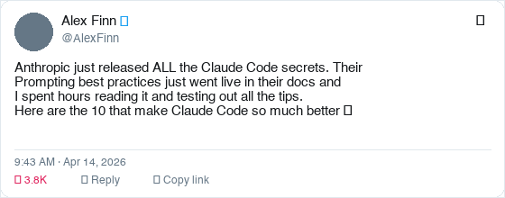 The video that captured this — Alex Finn's "The creator of Claude Code just revealed 7 secrets to using Claude Code (Opus 4.7)" — published today with strong early signal. But the substance predates the video. What Boris shared are the patterns his own team uses daily. The behavioral configurations they've wired into their workflows because they've learned, through thousands of hours of real usage, that these are the highest-leverage moves. This isn't a community tip list. It's creator-level intent.