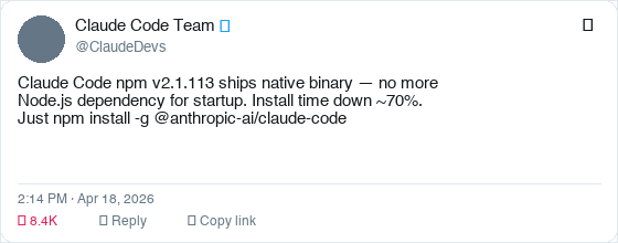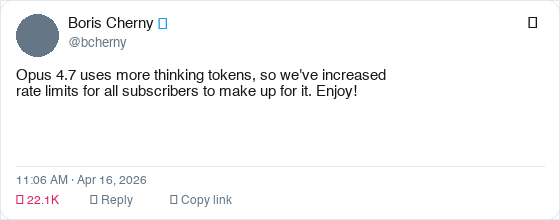 Boris's post landed on the same day Anthropic shipped Opus 4.7, native binary packages for Claude Code (no more Node.js startup dependency), raised rate limits for all subscribers, and fixed a long-context rate limit bug within hours of deployment. That's four coordinated launches in one day.