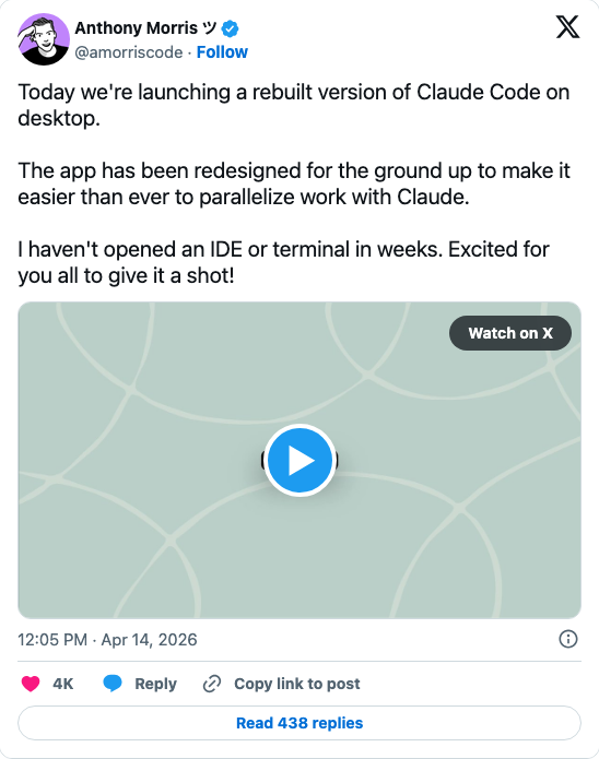 Boris Cherny, who led the rebuild at Anthropic, described it plainly: "I haven't opened an IDE or terminal in weeks." The desktop app is no longer a wrapper around the CLI — it's a purpose-built environment for parallelized agentic workflows.