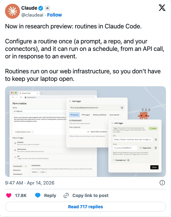 The official blog post put it plainly: routines let you "configure Claude Code once and run it automatically — on Anthropic's infrastructure, with no local machine required." Seven independent YouTube creators published Claude Code content the same day. The announcement hit 3.88 million views and 17,150 likes in under 24 hours.