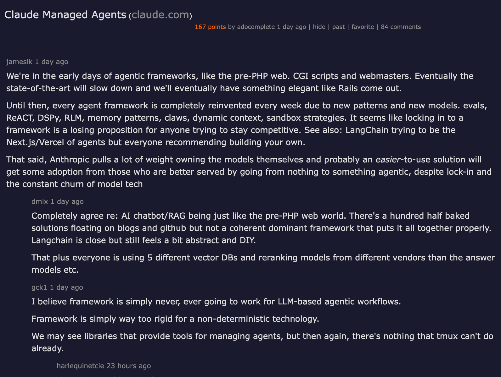 The HN thread on launch drew 167 points and 84 comments, with the most interesting discussion around a distinction that Anthropic's marketing glosses over: the difference between agents that genuinely operate autonomously and agents that chain API calls with a human-in-the-loop at each step.