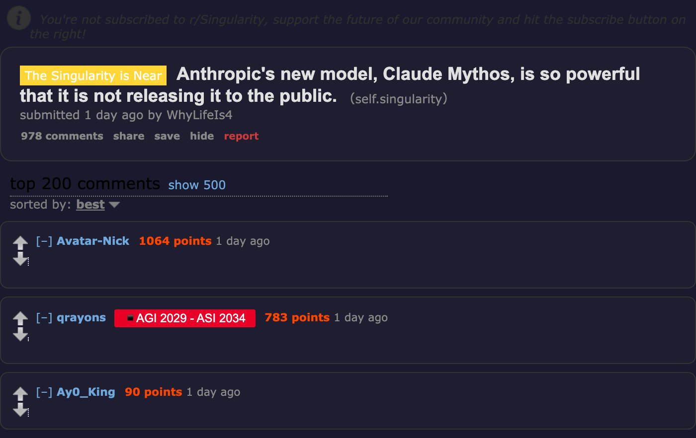 On r/singularity, the announcement hit 3,880 upvotes with 897 comments — the community split between awe at the capabilities and skepticism about the "too dangerous to release" framing.