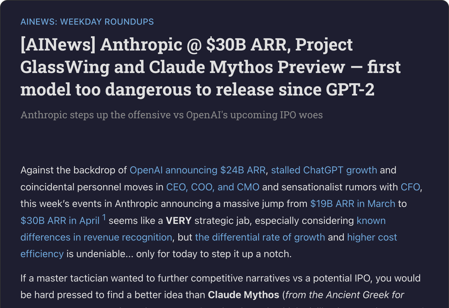 Latent Space called Mythos "the first model too dangerous to release since GPT-2" — framing the announcement as a historical inflection point. They also highlighted the $30B ARR figure, noting Anthropic's jump from $19B just weeks earlier.