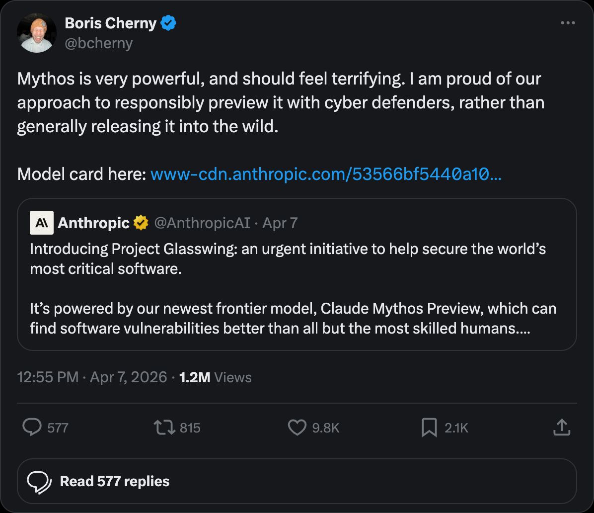 Anthropic researcher Boris Cherny confirmed on X with striking candor: "Mythos is very powerful, and should feel terrifying. I am proud of our approach to responsibly preview it with cyber defenders, rather than generally releasing it into the wild." The post drew 9,300+ likes and 1.17 million views — a rare moment of an insider acknowledging the danger of their own creation.