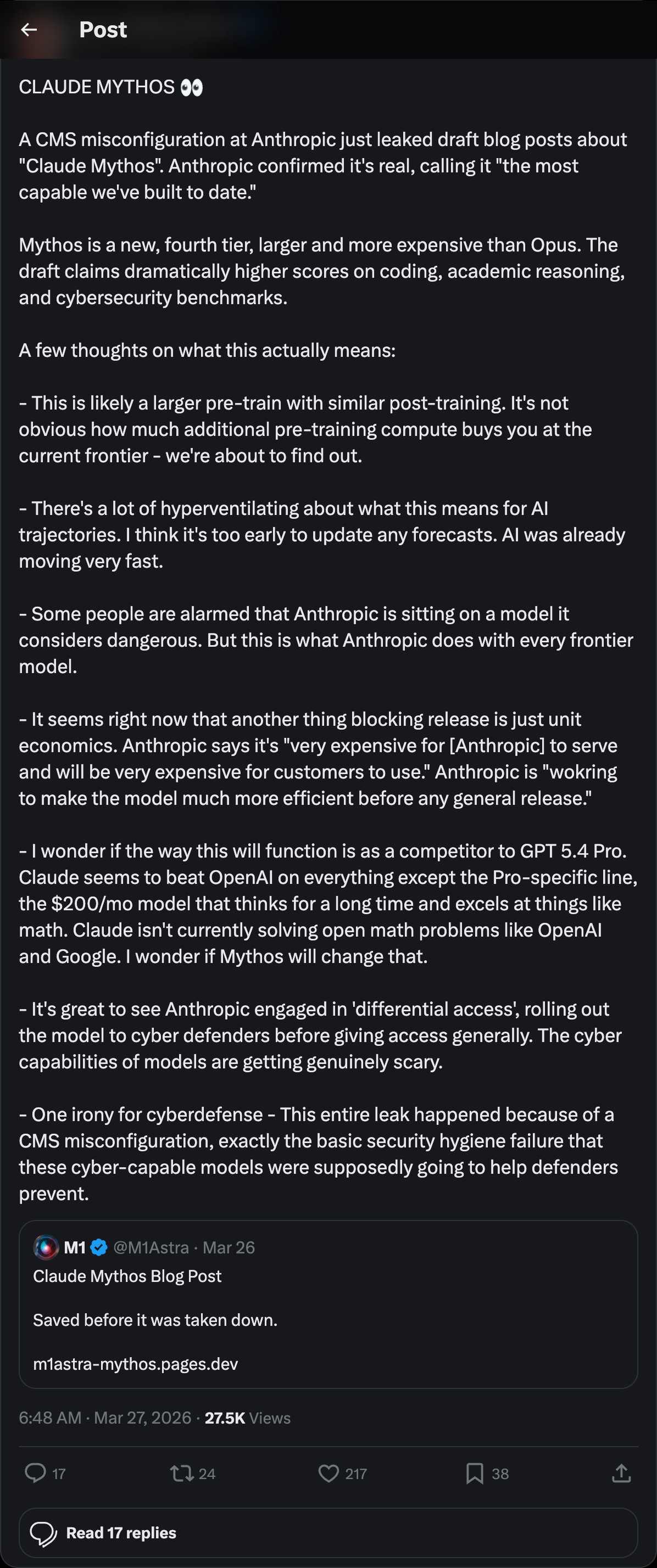 Delangue's irony is load-bearing. "Anthropic had the most powerful cyber-security model in the history of this world and their internal code base still leaked." If Mythos can find 27-year-old bugs in OpenBSD, why didn't it catch a CMS misconfiguration in Anthropic's own infrastructure?