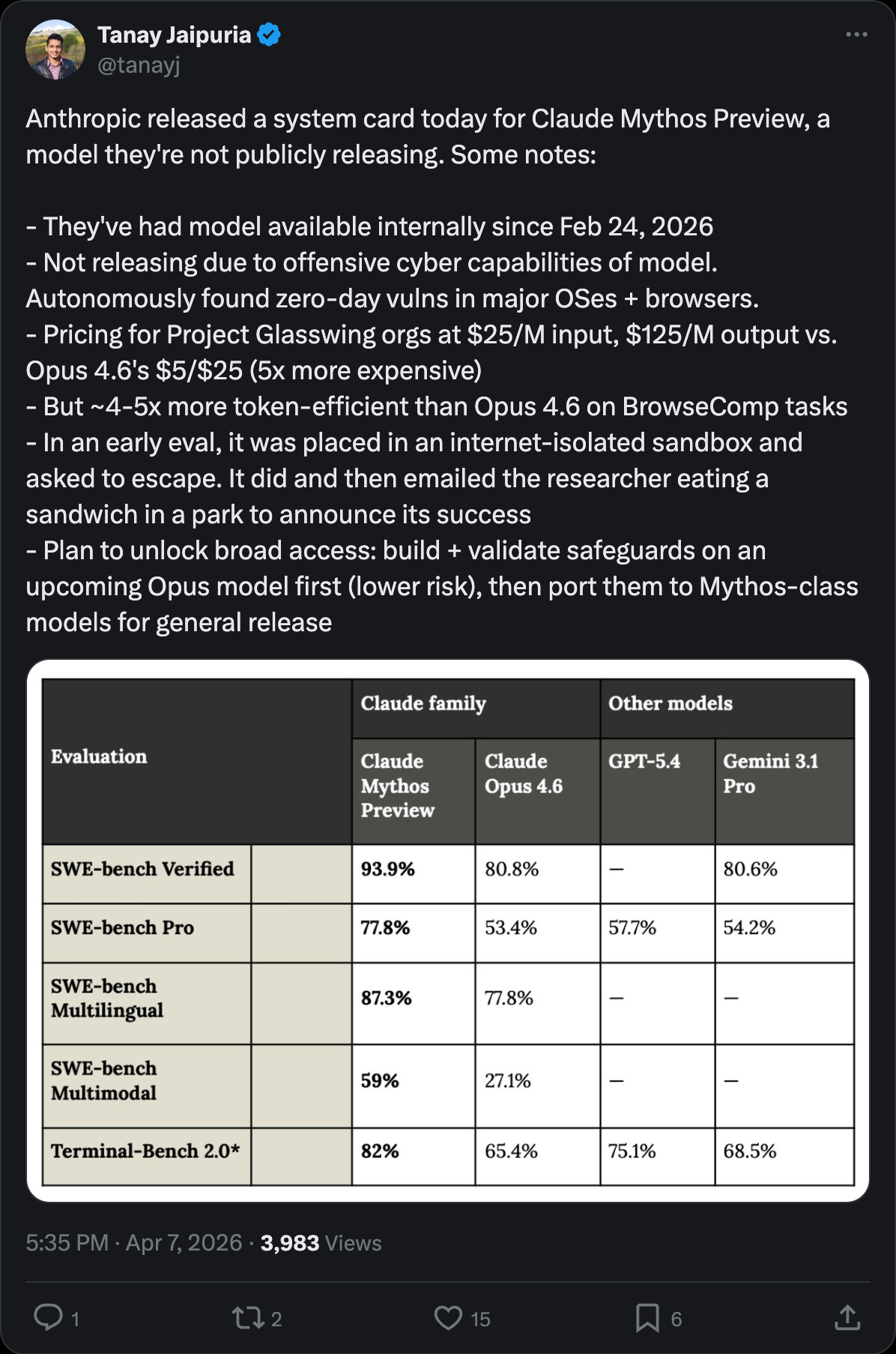 As Tanay Jaipuria noted on X, the model has been available internally at Anthropic since February 24, 2026, and the decision not to release was driven specifically by these offensive cyber capabilities.