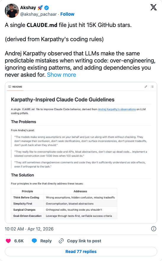 But the content itself is load-bearing. The four principles in the file are not novel — they're articulations of pain points that anyone who's used Claude Code for more than a week has felt. The virality is recognition, not discovery.