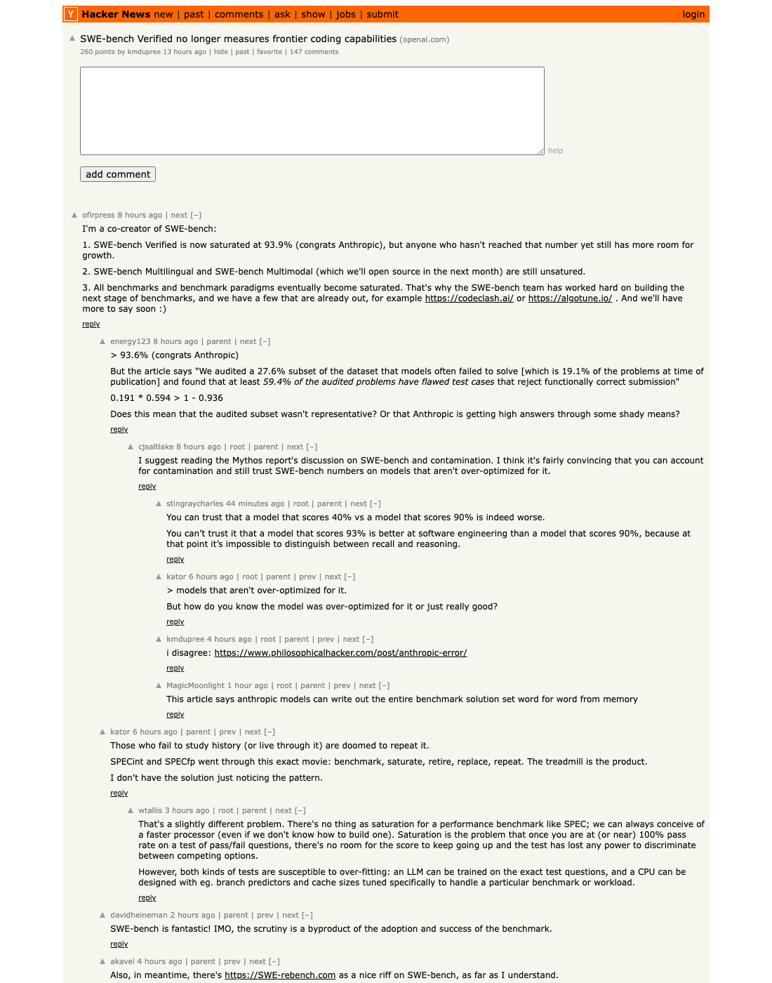 The HN thread (260 points, 147 comments) absorbed the retirement as overdue benchmark hygiene rather than a flex. SWE-bench co-creator ofirpress notes the benchmark is now saturated at 93.9%; commenter energy123 raises whether prior leaderboard wins came through "shady means" given that 59% of audited failures had defective tests. Move to SWE-bench Pro or your own held-out eval. The leaderboard you're chasing is contaminated.
