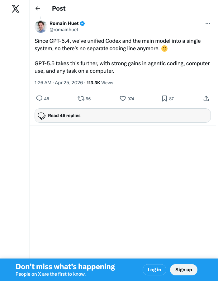 Step back. Two things happened on the same day. (1) OpenAI killed the Codex model line by folding it into GPT-5.5. (2) OpenAI publicly retired SWE-bench Verified as the coding benchmark — replacing it with SWE-bench Pro and signaling that they'll work with the industry on stronger evals. NVIDIA confirmed that GPT-5.5 was co-designed for GB200/300 systems and that the model itself helped improve its own inference stack.