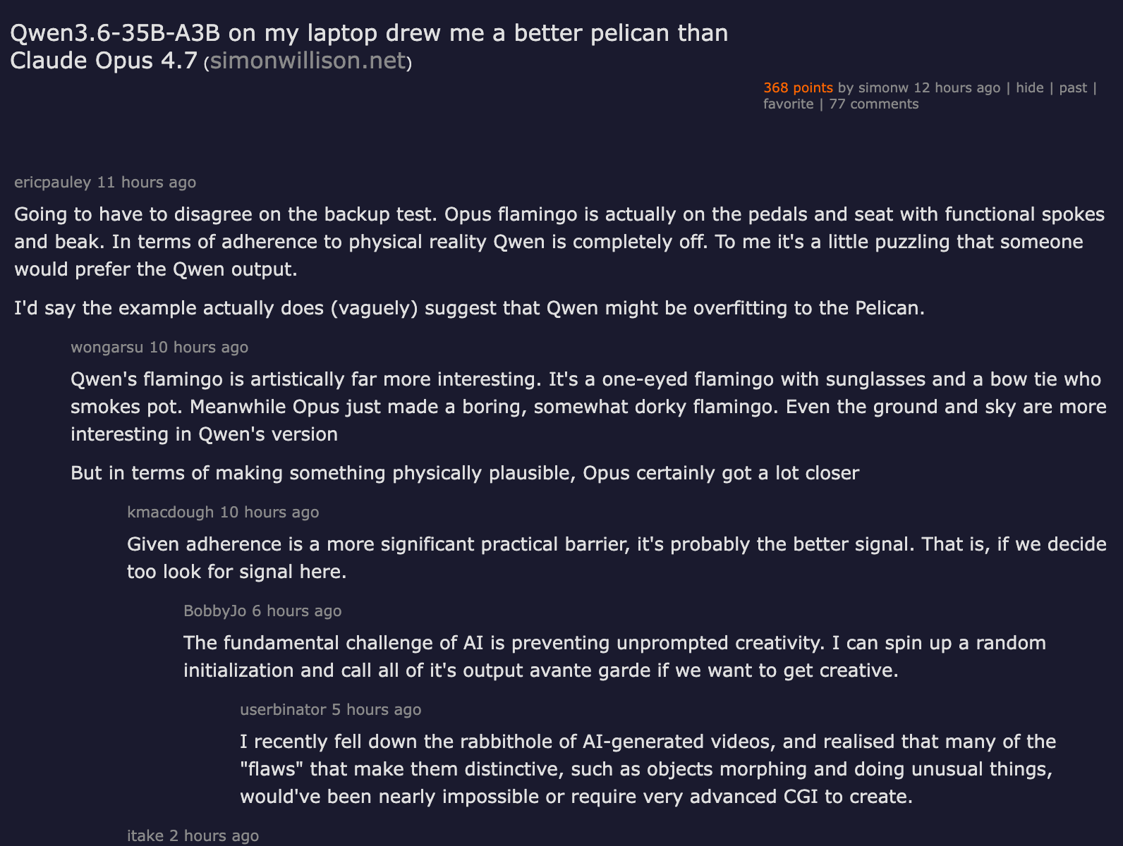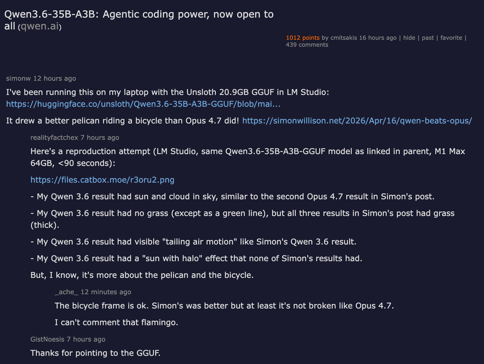 Simon Willison's benchmark post—"Qwen3.6-35B-A3B on my laptop drew me a better pelican than Claude Opus 4.7"—generated its own HN thread with 347 points and 75 comments, separating the community reaction to the local performance story from the general release discussion.