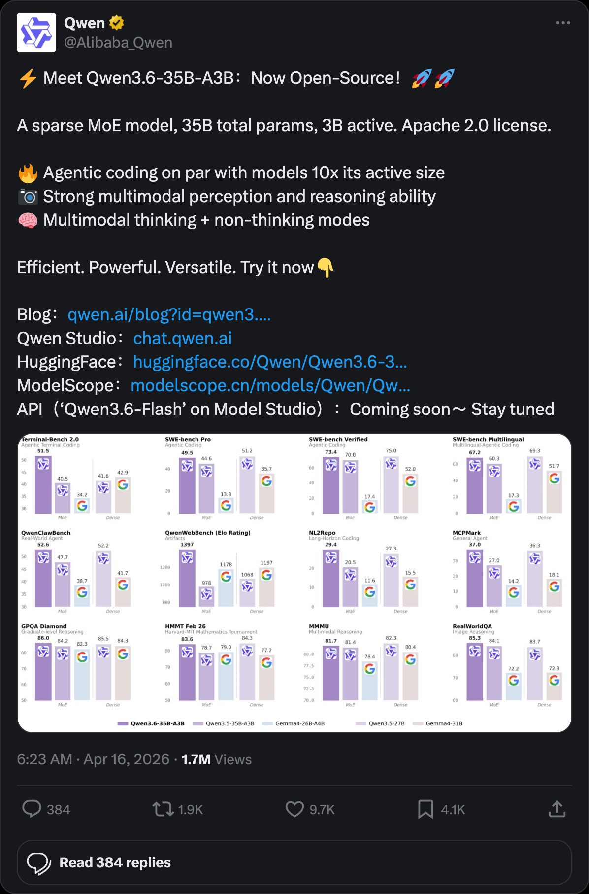 Alibaba released Qwen3.6-35B-A3B on April 16, 2026, and by that afternoon it had done something no open-source model had managed cleanly before: running on a MacBook Pro M5 and outperforming Claude Opus 4.7 on a benchmark test. The model is a sparse Mixture-of-Experts (MoE) architecture with 35 billion total parameters but only 3 billion active per forward pass, under an Apache 2.0 license with full commercial use permitted. Developer Simon Willison tested it locally via LM Studio using a 20.9GB quantized build, and gave the win to Qwen—Opus 4.7 "managed to mess up the bicycle frame."