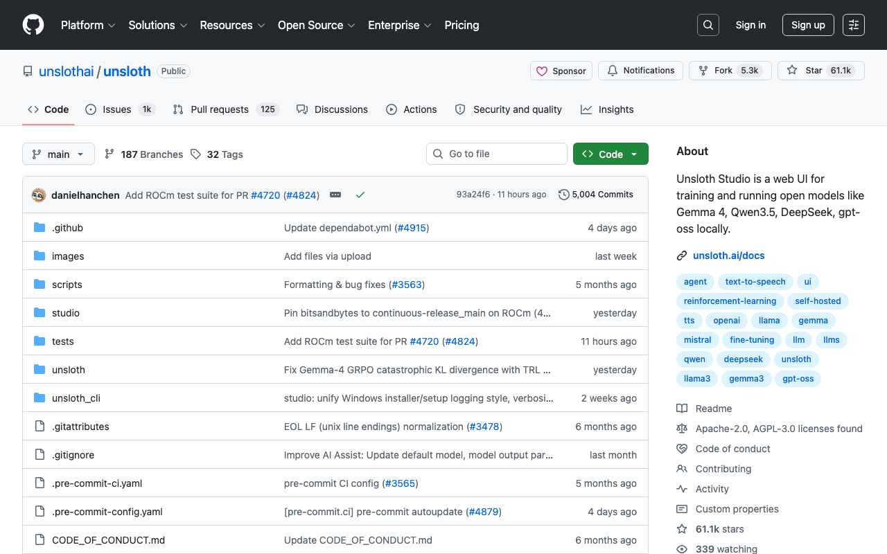 Unsloth supports NVIDIA GPUs, CPUs, and Apple MLX. It handles Gemma 4, Qwen 3.5, Llama 3.1, and over 500 other models. The dual license (Apache 2.0 for core, AGPL-3.0 for Studio) keeps the core engine fully open.