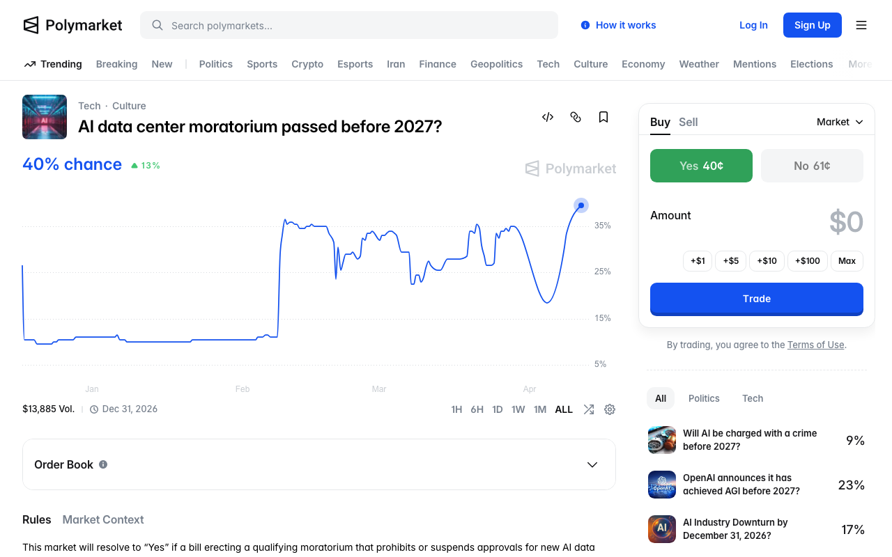 Meanwhile, prediction markets are pricing a 33.5% chance of a federal data center moratorium before 2027. Senator Mark Warner called the idea "idiocy," but the fact that a third of the market thinks it is plausible tells you something about the trajectory.
