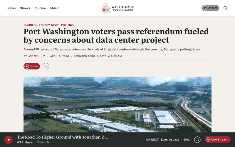 Port Washington, Wisconsin just passed the nation's first anti-data center referendum, requiring voter approval for any future development incentive over $10 million. The vote was not close — 66 percent in favor, with more than half the city's registered voters turning out. This is not NIMBY noise. It is a structural signal.